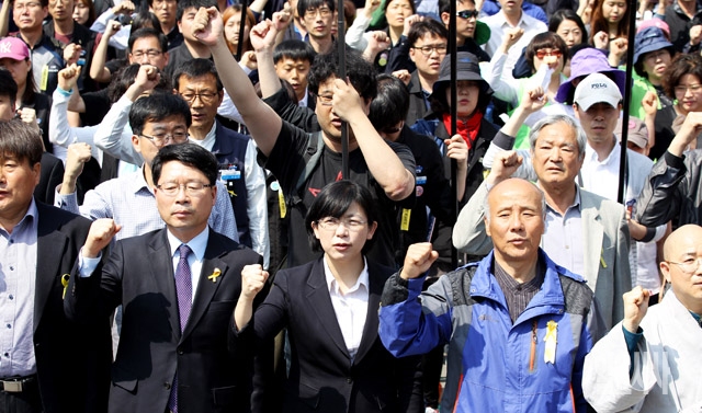 근로자의 날(노동절)인 1일 서울역 앞 광장에서 열린 세계노동절대회에서 통합진보당 이정희 대표, 오병윤 원내대표 등 참가자들이 구호를 외치고 있다.