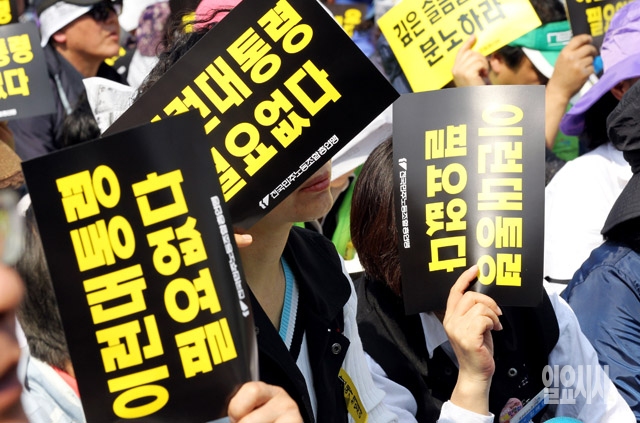 근로자의 날(노동절)인 1일 서울역 앞 광장에서 열린 세계노동절대회에서 참석자들이 손피켓을 들고 있다.