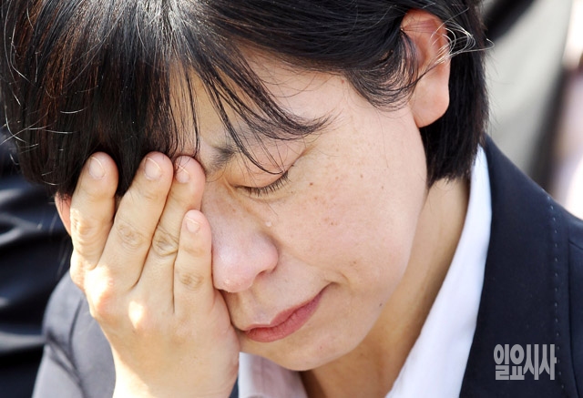 근로자의 날(노동절)인 1일 서울역 앞 광장에서 열린 세계노동절대회에서 통합진보당 이정희 대표가 세월호 희생자들을 생각하며 눈물을 흘리고 있다.