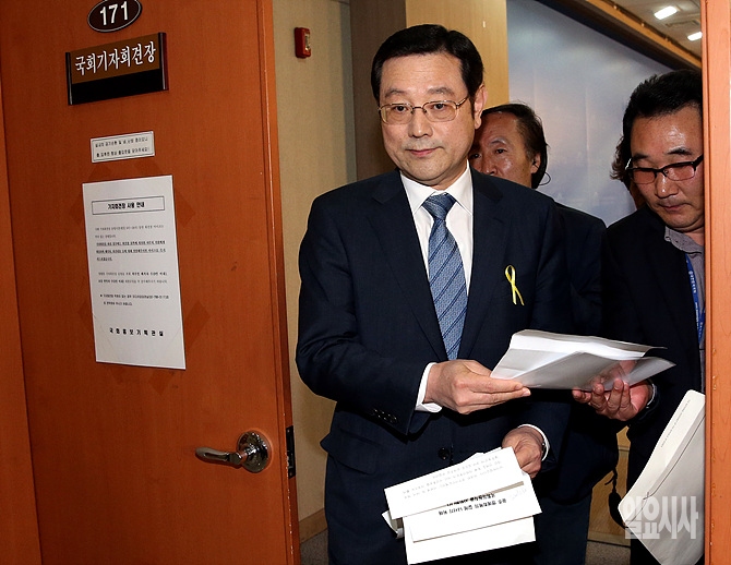 최근 광주광역시장 전략공천 논란으로 새정치민주연합을 탈당했던 이용섭 의원이 7일 오전, 서울 여의도 정론관에서 광주시장 출마 관련 기자회견 직후 정론관을 빠져나오고 있다.