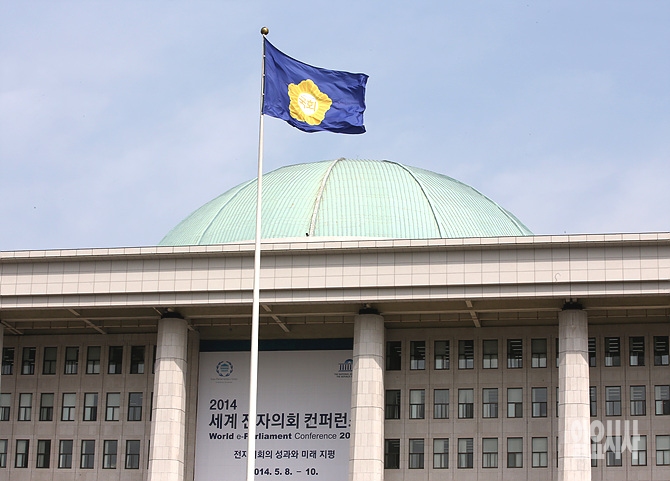 7일, 서울 여의도 국회의사당 앞 국기게양대에 한글로 바뀐 국회기가 힘차게 펄럭이고 있다.