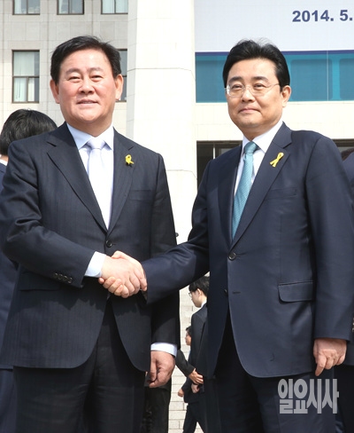 7일 오전, 서울 여의도 국회 본청 앞에서 열린 박준규 전 국회의장 노제직전, 새누리당 최경환 원내대표(사진 왼쪽)와 새정치민주연합 전병헌 원내대표가 악수하고 있다.