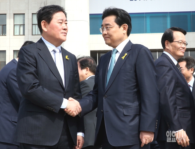 최경환·전병헌 원내대표가 7일 오전, 서울 여의도 국회 본청 앞에서 열린 박준규 전 국회의장 노제에 참석해 악수를 나누고 있다.