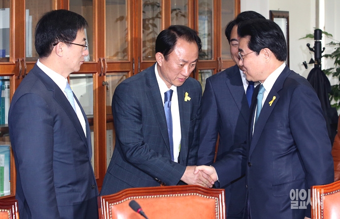 7일 오전, 새정치민주연합 전병헌 원내대표가 서울 여의도 국회에서 열린 원내대표 퇴임 간담회 직전, 김명진 특보와 악수를 나누고 있다.