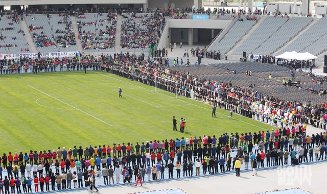 2014 인천아시아게임 주경기장 준공식이 7일 인천시 서구 인천아시아드주경기장에서 열렸다. 이날 행사에 참석한 송영길 인천시장을 비롯한 아시안게임 관계자들과 시민 등 2014명이 테이프를 자르고 있다.