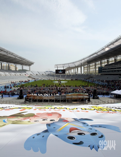 2014 인천아시아게임 주경기장 준공식이 7일 인천시 서구 인천아시아드주경기장에서 열렸다. 이날 행사에 참석한 송영길 인천시장을 비롯한 아시안게임 관계자들과 시민 등 2014명이 테이프를 자르고 있다.