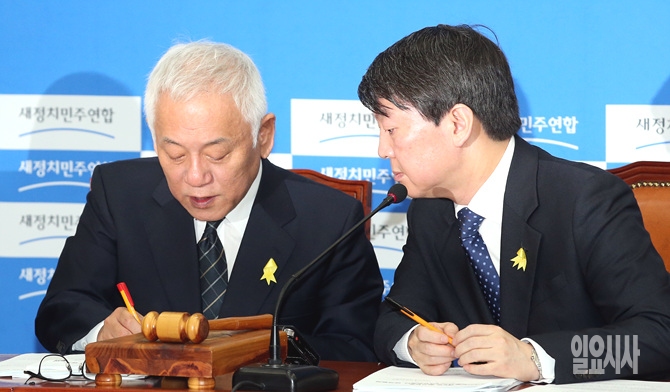 7일, 서울 여의도 국회에서 열린 새정치민주연합 최고위원-여객선 침몰사고대책위 연석회의 도중 안철수 공동대표가 김한길 공동대표의 메모를 보고 있다.