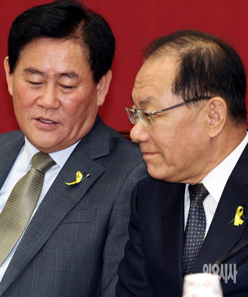 8일 서울 여의도 국회에서 열린 새누리당 국가재난안전 확대최고회의에서 황우여 대표(오른쪽)와 최경환 원내대표가 이야기를 나누고 있다.