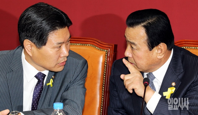 9일 서울 여의도 국회에서 열린 새누리당 주요당직자회의에서 이완구 원내대표(왼쪽)와 홍문종 사무총장이 이야기를 나누고 있다.
