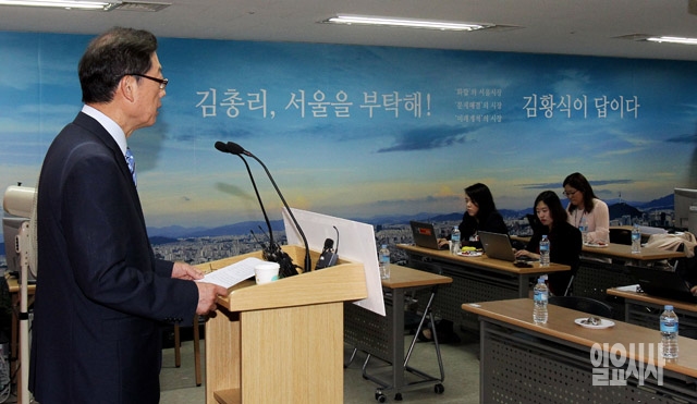 김황식 새누리당 서울시장 예비후보가 9일 서울 여의도 캠프에서 경선을 3일 앞두고 각오를 밝히는 기자회견을 하고 있다.