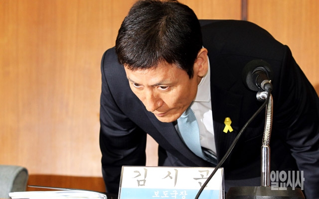 김시곤 KBS 보도국장이 9일 서울 여의도 KBS 신관에서 기자회견을 갖기에 앞서 인사하고 있다. 이날 김 국장은 세월호 사고 희생자와 교통사고 사망자 수를 비교한 발언과 관련해 파장이 일자 기자회견을 갖고 사의를 밝혔다.