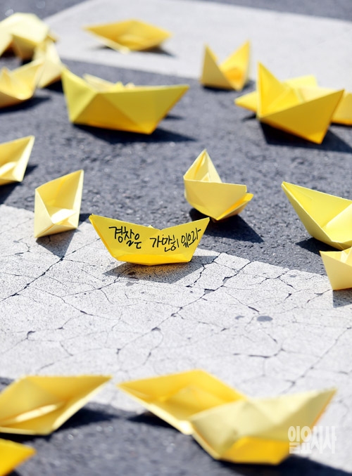 9일 세월호 참사 유가족들이 박근혜 대통령과 면담을 요청한 가운데 서울 종로구 청운동사무소 앞 거리에 세월호 참사 희생자들을 추모하는 노란 종이배가 놓여 있다.