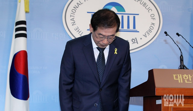 박원순 서울시장이 12일 서울 여의도 국회 정론관에서 기자회견을 갖기에 앞서 인사하고 있다.