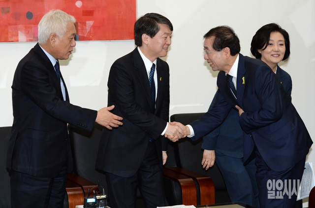 박원순 서울시장이 12일 서울 여의도 국회 새정치민주연합 당대표실에서 김한길·안철수 공동대표, 박영선 원내대표와 인사를 나누고 있다.