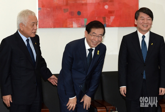 박원순 서울시장이 12일 서울 여의도 국회 새정치민주연합 당대표실에서 김한길·안철수 공동대표를 예방, 인사를 하고 있다.