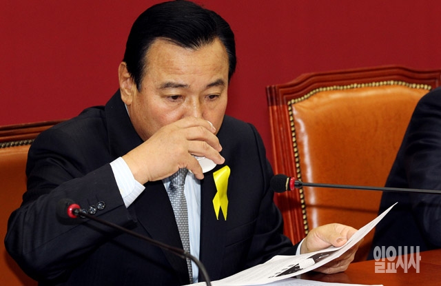 이완구 새누리당 원내대표가 12일 서울 여의도 국회에서 열린 최고위원회의에서 물을 마시고 있다.