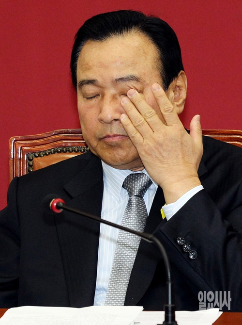 이완구 새누리당 원내대표가 12일 서울 여의도 국회에서 열린 최고위원회의에서 눈가를 만지고 있다.