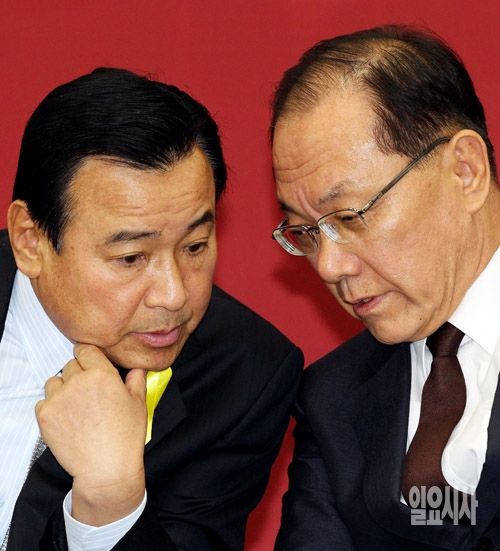 황우여 새누리당 대표(오른쪽)와 이완구 원내대표가 12일 서울 여의도 국회에서 열린 최고위원회의에서 이야기를 나누고 있다.