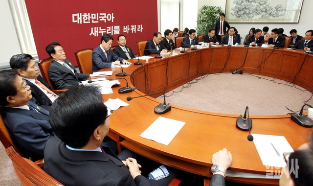 황우여 새누리당 대표를 비롯한 지도부들이 12일 서울 여의도 국회에서 열린 최고위원회의를 갖고 있다.