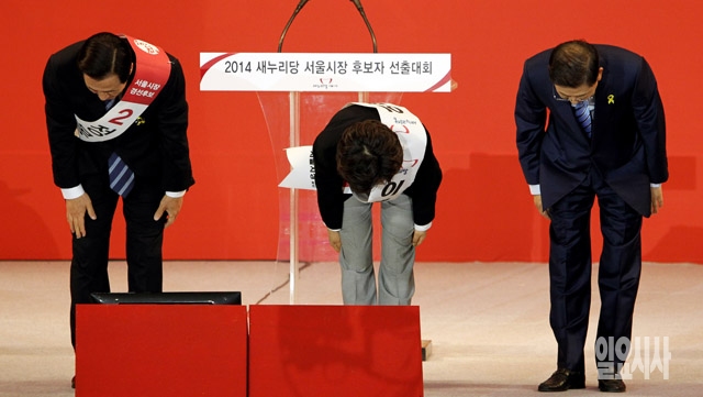 정몽준(왼쪽부터), 이혜훈, 김황식 새누리당 서울시장 예비후보가 12일 서울 방이동 올림픽공원 체조경기장에서 열린 2014 전국동시지방선거 새누리당 서울시장 후보자 선출대회에서 허리 숙여 인사하고 있다.