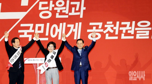 정몽준(왼쪽부터), 이혜훈, 김황식 새누리당 서울시장 예비후보가 12일 서울 방이동 올림픽공원 체조경기장에서 열린 2014 전국동시지방선거 새누리당 서울시장 후보자 선출대회에서 손을 맞잡고 인사하고 있다.