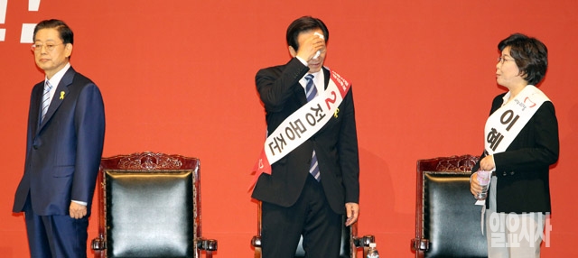 김황식(왼쪽부터), 정몽준, 이혜훈 새누리당 서울시장 예비후보가 12일 서울 방이동 올림픽공원 체조경기장에서 열린 2014 전국동시지방선거 새누리당 서울시장 후보자 선출대회에 참석해 있다.