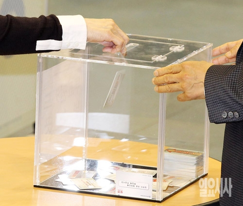 2014 전국동시지방선거 새누리당 서울시장 후보자 선출대회가 열린 12일 서울 방이동 올림픽공원 체조경기장에서 당원들이 투표를 하고 있다.