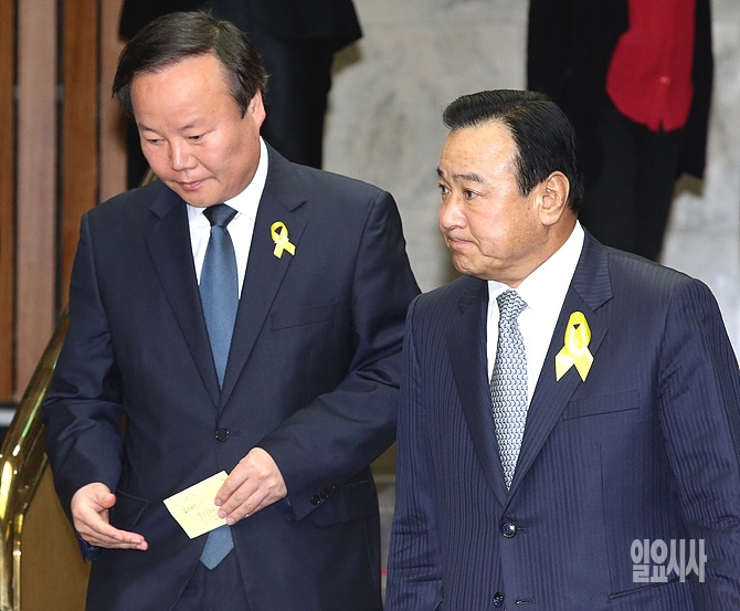 13일 오전, 서울 여의도 국회에서 열린 세월호사고대책특위 연석회의 참석을 위해 이완구 신임 새누리당 원내대표(사진 오른쪽)와 김재원 의원이 입장하고 있다.