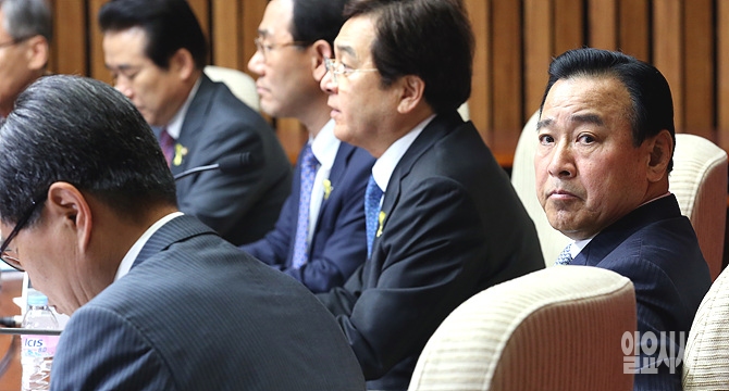 13일 오전, 서울 여의도 국회에서 열린 세월호사고대책특위 연석회의 도중 이완구 신임 새누리당 원내대표가 다른 곳을 응시하고 있다.