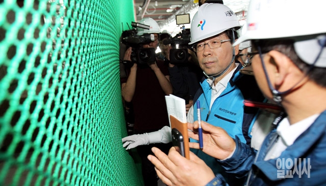 박원순 서울시장이 13일 서울 송파구 신천동 제2롯데월드 신축공사 현장을 방문해 안전점검을 하고 있다.