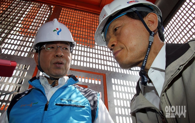 박원순 서울시장(왼쪽)이 13일 서울 송파구 신천동 제2롯데월드 신축공사 현장을 방문해 안전점검을 하고 있다.