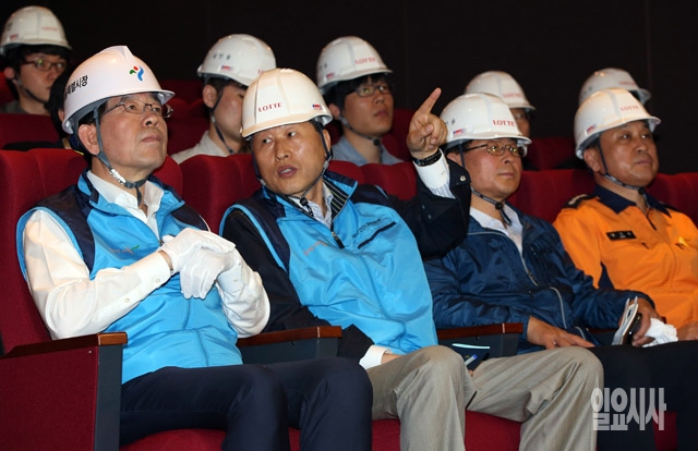 박원순 서울시장이 13일 서울 송파구 신천동 제2롯데월드 신축공사 현장을 방문해 관계자의 설명을 듣고 있다.