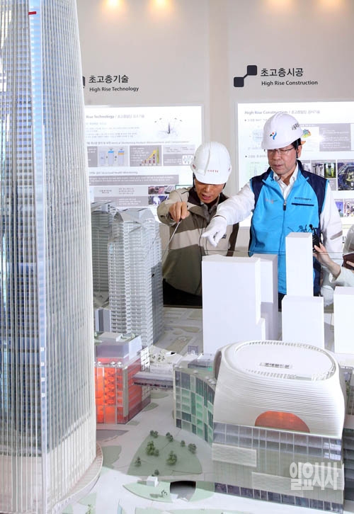 박원순 서울시장이 13일 서울 송파구 신천동 제2롯데월드 신축공사 현장을 방문해 관계자의 설명을 듣고 있다.
