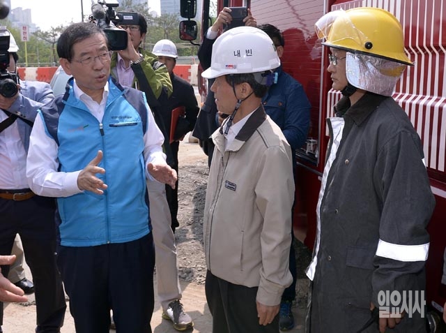 박원순 서울시장이 13일 서울 송파구 신천동 제2롯데월드 신축공사 현장을 방문해 안전점검을 하고 있다.