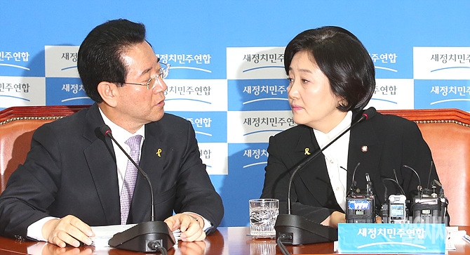 12일, 새정치민주연합 박영선 원내대표가 서울 여의도 국회에서 열린 세월호 관련 원내대책회의 도중 김영록 원내수석부대표와 이야기를 나누고 있다.