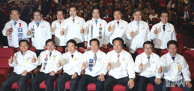 13일 오후, 서울 여의도 국회 의원회관에서 열린 6·4지방선거 중앙선거대책위원회 발대식에 유정복 인천시장 후보, 남경필 경기도지사 후보, 정몽준 서울시장 후보, 정진석 충남도지사 후보 등 출마자들이 엄지를 치켜 세우고 있다.
