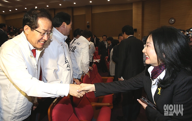 13일 오후, 서울 여의도 국회 의원회관에서 열린 6·4지방선거 중앙선거대책위원회 발대식에 홍준표 경남도지사 후보가 문정림 의원과 악수를 나누고 있다.