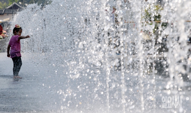 14일 연일 계속되는 무더운 날씨가 이어지는 가운데 서울 광화문광장 분수를 찾은 한 어린이가 더위를 식히고 있다.