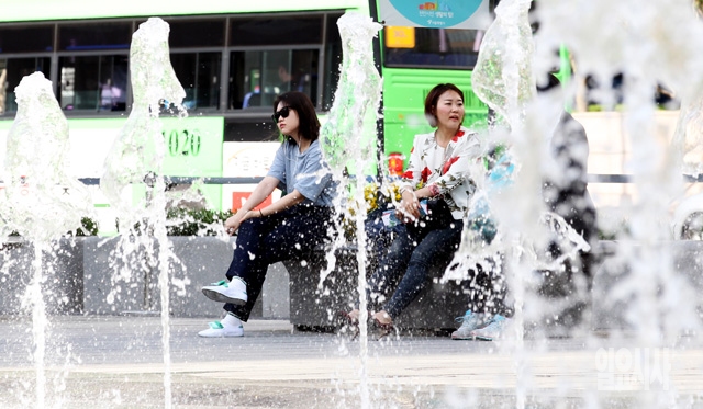 14일 연일 계속되는 무더운 날씨가 이어지는 가운데 서울 광화문광장 분수를 찾은 시민들이 더위를 식히고 있다.
