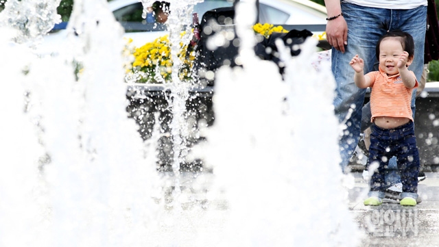 14일 연일 계속되는 무더운 날씨가 이어지는 가운데 서울 광화문광장 분수를 찾은 한 아이가 더위를 식히고 있다.