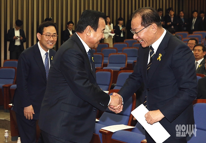 14일 오후, 서울 여의도 국회에서 열린 새누리당 의원총회에서 황우여 대표(사진 오른쪽)와 이완구 원내대표가 악수를 나누고 있다.