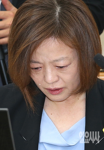 14일 오후, 서울 여의도 국회에서 열린 세월호 대책 관련 안행부 전체회의 도중 새정치민주연합 진선미 의원이 눈물을 흘리고 있다.