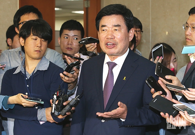 14일 오후, 서울 여의도 국회에서 새정치민주연합 김진표 의원이 6·4지방선거 경기도지사 후보 등록을 위해 국회의원직 사퇴 기자회견 후 취재진의 질문에 답하고 있다.