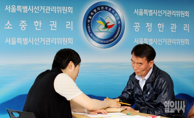 전국동시지방선거 후보자 등록 신청 접수 첫날인 15일 서울 종로구 서울시선거관리위원회의에서 후보들이 등록을 하고 있다.