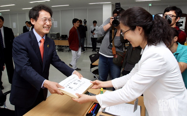 조희연 서울시교육감 후보가 15일 서울 종로구 서울시선거관리위원회의에서 후보등록을 하고 있다.