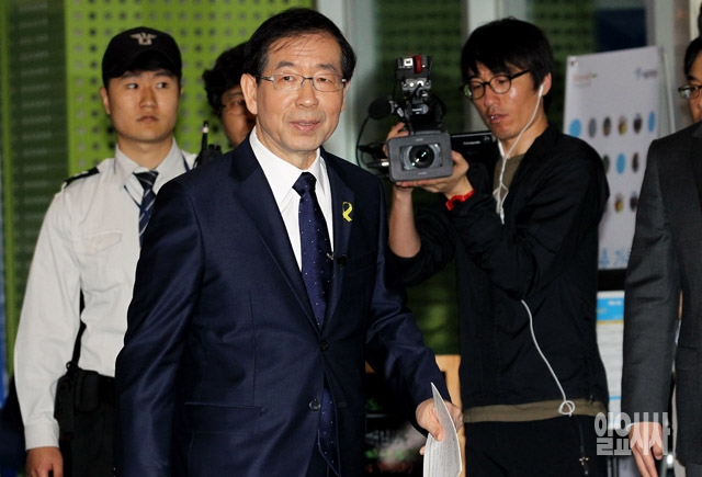 박원순 서울시장 후보가 15일 서울시청에서 서울시장 출마선언 기자회견을 갖기 위해 들어서고 있다.