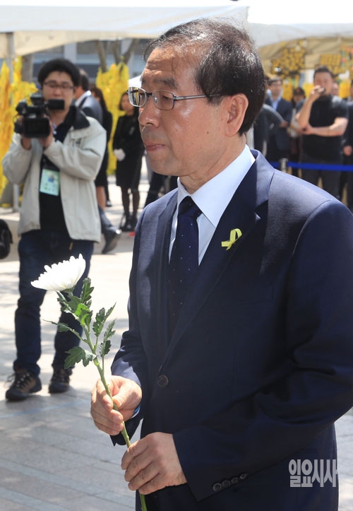 박원순 서울시장 후보가 15일 서울광장에 마련된 세월호 침몰사고 희생자 분향소를 찾아 헌화하고 있다.