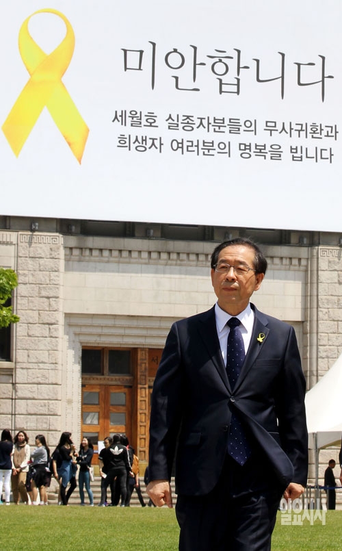 박원순 서울시장 후보가 15일 서울광장에 마련된 세월호 침몰사고 희생자 분향소를 찾아 추모를 한 뒤 나서고 있다.