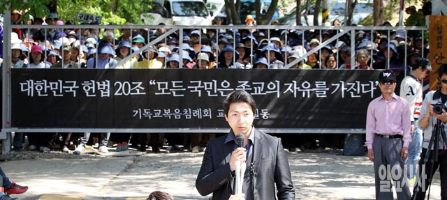 15일 경기도 안성시 금수원 정문 앞에서 기독교복음침례회(구원파) 신도들이 입구를 봉쇄한 가운데 구원파 대변인이 입장을 밝히는 기자회견을 갖고 있다.