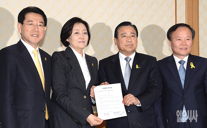 이완구 새누리당 원내대표(사진 오른쪽에서 두 번째)와 박영선 새정치민주연합 원내대표(사진 왼쪽에서 두 번째)가 15일, 국회 귀빈식당에서 열린 여야원내 4자회동에서 오는 19일부터 한달 간 임시국회를 열기로 한 합의문을 들어보이고 있다.